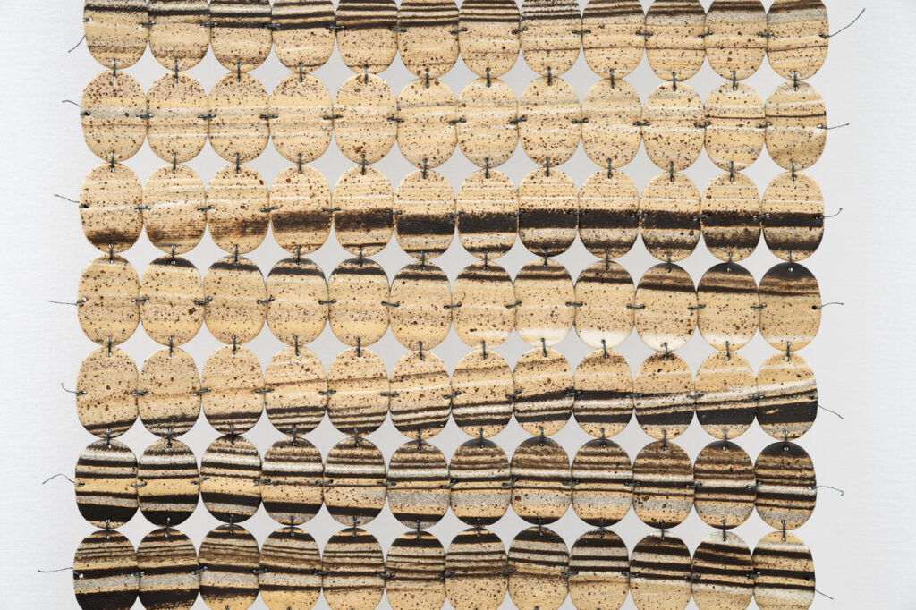 Sophie Manessiez crée des œuvres sculpturales en porcelaine façonnées à la main et reliées par un tissage au fil. Ses compositions suspendues explorent les tensions entre fragilité, force collective et équilibre, où chaque élément, unique, participe à la cohésion de l’ensemble. Elle expose au Canada, en France et aux États-Unis, notamment à Révélations, au Grand Palais à Paris.